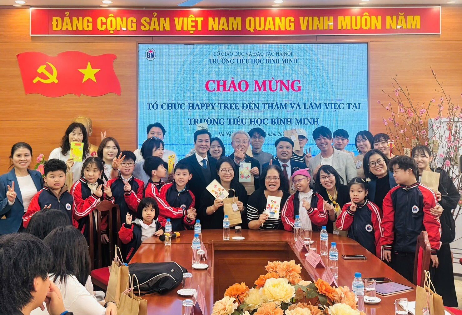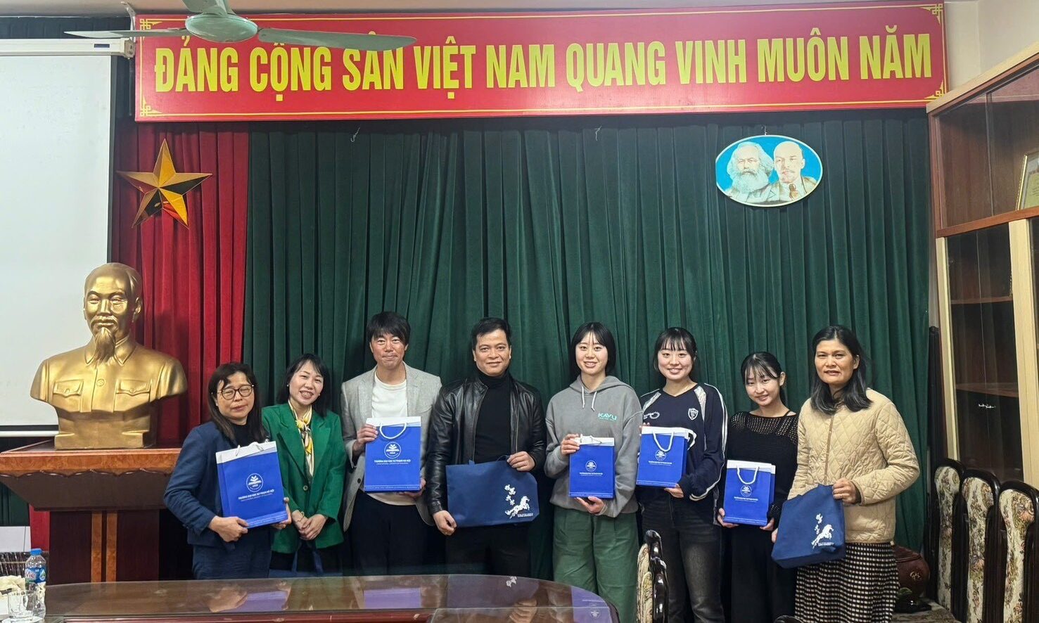 ①ハノイ教育大学、幼児教育学部トゥン学部長(左から4番目)特別教育学部トゥー副学部長(左から2番目)らから歓迎を受ける本学教員・学生