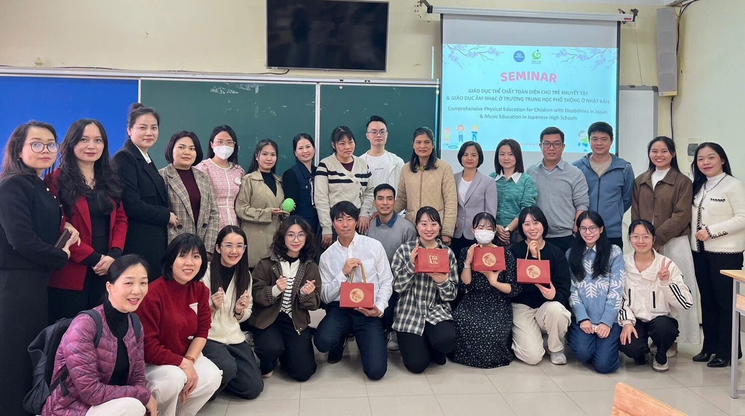 短期留学研修には狩野紗花さん(音楽教育4年)、大野結音さん(音楽教育4年)、竹田蘭さん(保健体育専攻3年)の3名の学生が参加し、ハノイ教育大学にて学生間交流、合同セミナーでの発表などを行いました。研修中には現地、在外日本人学校や国立ビンミンインクルーシブ学校他での教育現場実習も行い、異文化理解や国際感覚を養いました。